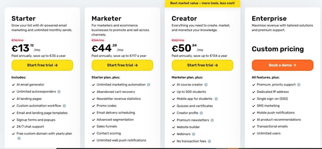 | Enterprise | Custom Pricing | Custom Pricing | Custom Pricing | All Creator features plus premium, priority support; dedicated IP address; single sign-on (SSO); SMS marketing; mobile push notifications; AI product recommendations; transactional emails; unlimited users. |