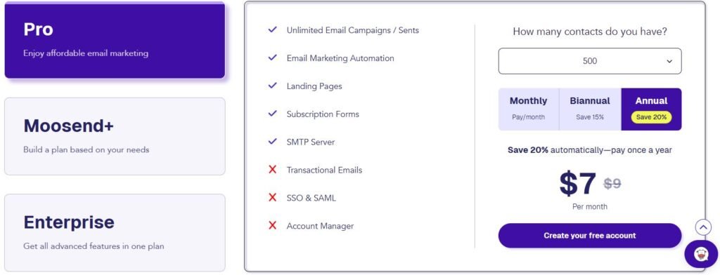 Moosend is a solid and affordable choice for both individuals and businesses. Compared to other email marketing platforms, its pricing is very competitive, with the Starter plan beginning at just $7 per month, making it an excellent option for small businesses, freelancers, and creators who want professional email marketing without breaking the bank.